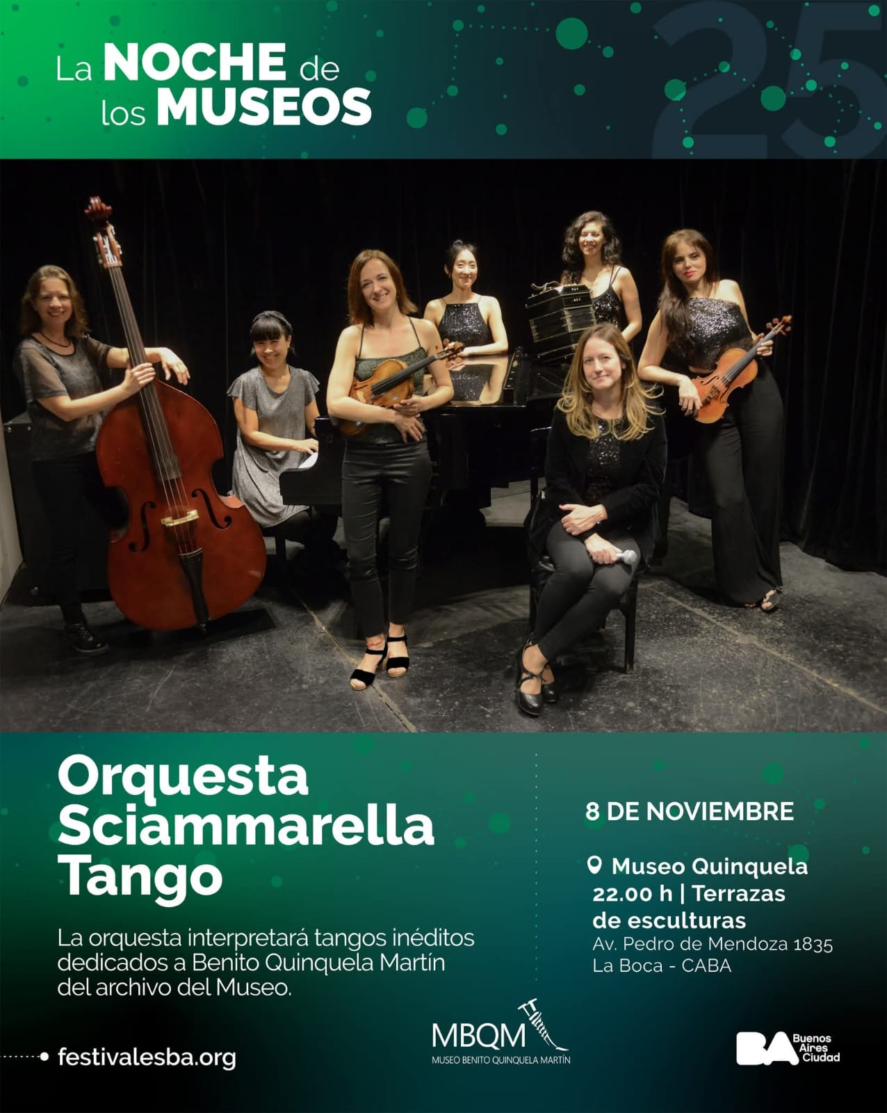 El próximo sábado la emblemática terraza de esculturas del museo abrirá sus puertas para una velada única: la prestigiosa Orquesta Sciammarella Tango estrenará un repertorio especial de tangos inéditos dedicados a Benito Quinquela Martín, extraídos directamente de su archivo histórico.